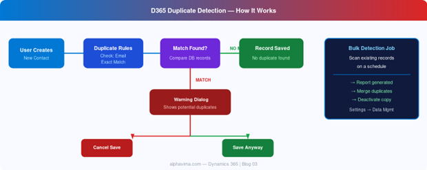 When a user creates or updates a record, Dynamics 365 runs the active duplicate detection rules for that entity. If a match is found:- Warning mode: The user sees a dialog showing potential duplicates and can choose to proceed or cancel